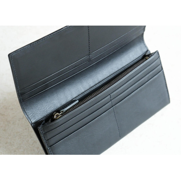 収納は確保しながらも、小銭入れ部分の重なりを抑え、閉じたときの厚みをすっきりさせています。
