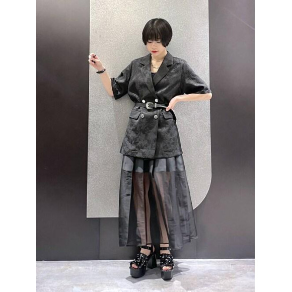 ジャガード生地を贅沢に使用した モードに決まるテーラードジャケット 存在感のある生地なのでインナーはシンプルでも〇 セットアップでの着用は勿論、シンプルなパンツやスカート合わせもおすすめです◎ ベルトを締めるとウエストマークも出来てスタイルアップ! チュールスカートを合わせて大人モードな雰囲気に⬛