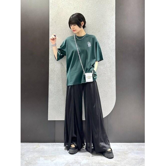 カラーTシャツは、フラワーモチーフや幾何学模様をコラージュしたアート性の高いグラフィックをオリジナルで作成。 左胸部分に小さめのロゴと、バックに大胆にプリントを施すことでどこから見ても存在感のあるアイテム。 滑らかな肌触りで表面感の綺麗なポンチ素材を使用。 パンツはシアー生地をレイヤードしたデザイン。 揺れるシアーがモードな雰囲気を演出し、存在感◎