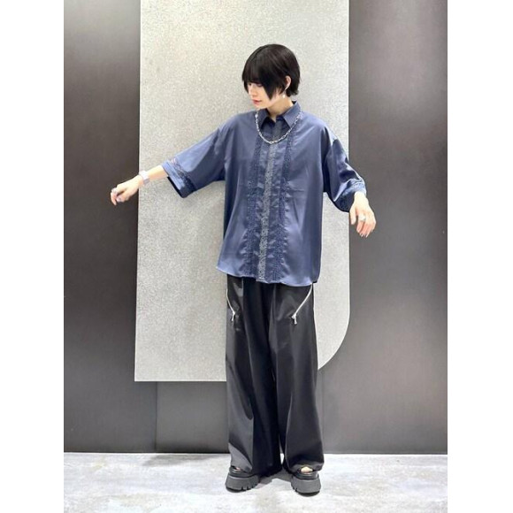 レーステープとトライバル柄の刺繍をあしらったデザインアイテム レースと刺繍を微配色で取り入れることでデザインのアクセントに! 袖口をレースで切り替えることで夏らしく色気のある透け感をプラス。 適度なハリ感と落ち感を兼ね備えたポリエステル生地で洗濯後にシワになりにくいのもポイント。 パンツは太腿部分にZIPデザインを施したデザインパンツ。 リラックスして履ける幅のあるワイドシルエット。 センタープレスを入れることで縦のラインが強調されてスタイルアップ効果〇