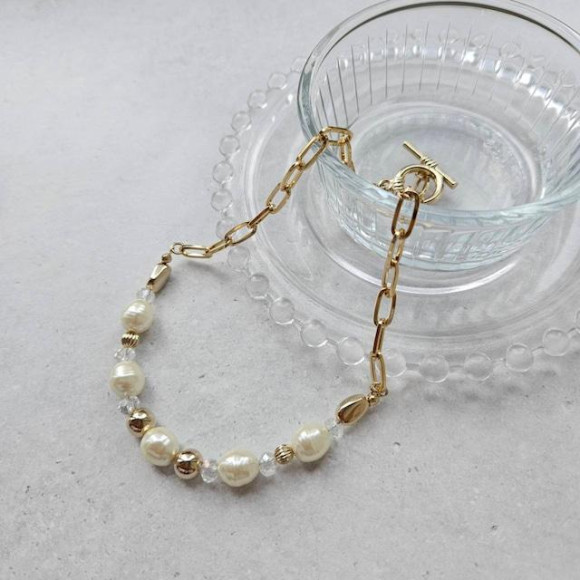 パールビーズを前にしたり、チェーンを前にしたり、それぞ半分ずつ見せたり、