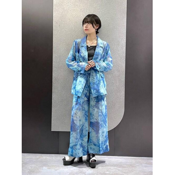 オリジナルのオーロラ柄を使用した シアー素材のテーラードジャケット! 緩めなシルエットに透け素材で軽量感があるため、ラフにさらっと羽織れちゃいます! 同柄のセットアップで着ると統一感もでて◎ ライブやイベントにも