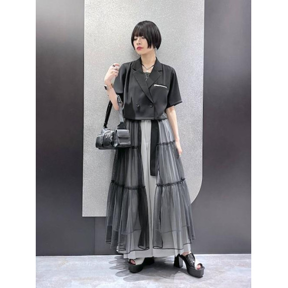 モノトーンスタイリング⬛ ショートジャケットはトロミ素材が涼しい一枚。 柔らかい生地感でストレスフリーに着ていただけます! プリーツパンツにはチュールベルトスカートを合わせてボリュームを出すと、足も長く見えるのでおすすめです!
