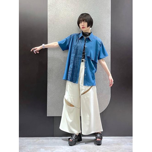 プリーツシャツはサラッと着やすい、着丈がゆっくりなのでイン&アウトどちらでも◎