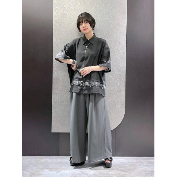 袖と裾に刺繍が施されたデザインシャツ 羽織るだけで上品見えするアイテムは、シンプルになりがちな夏のスタイリングにぴったりです! あえてタックインせずに柄を見せて着るのがポイント! ワイドパンツで中性的なモードスタイリングに!