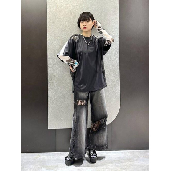 デザインデニムとトップスはレースで透け感があり涼しい印象に!