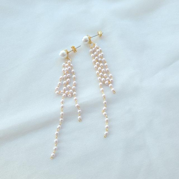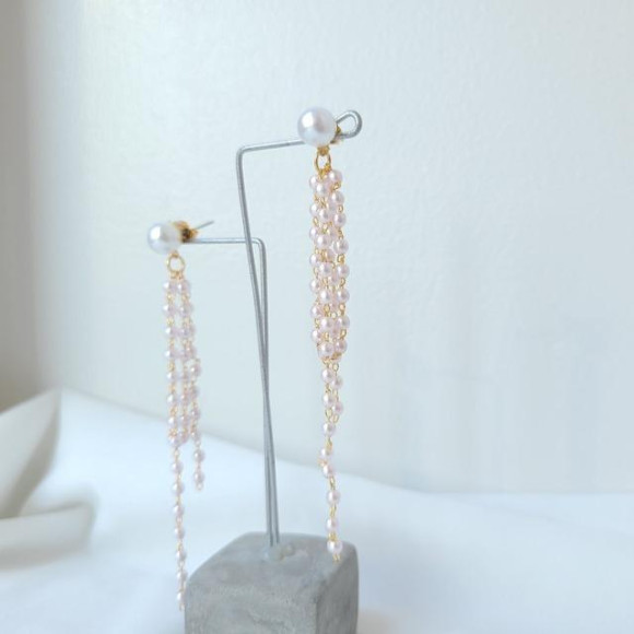 小さいパールをふんだんに使い、長さの違うデザインに仕上げたピアス。
