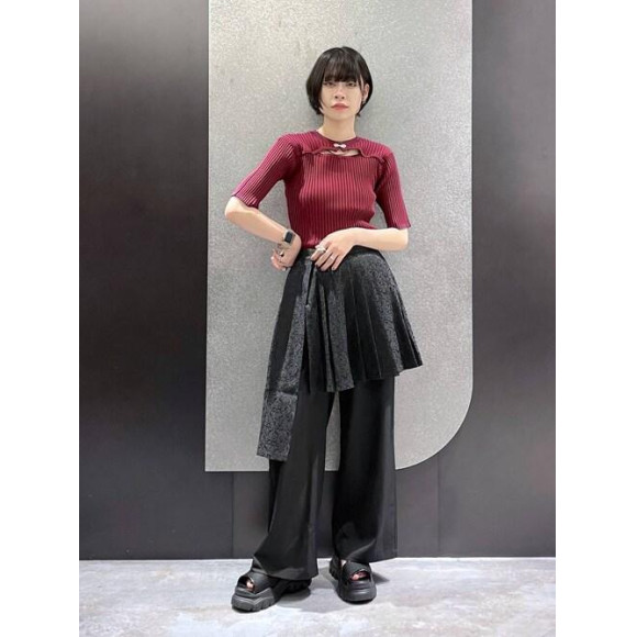 胸元のメタルボタンがモードなリブニット タイトシルエットながらも伸縮性のある素材を使用しストレスフリーな着心地! フロントカットアウトデザインで程よい肌見せが叶います。 襟や袖口はさりげない配色デザインででアクセントに! 身頃の斜めに入った編み地でシャープさのでる仕様! ラップパンツはジャガード柄が高級感⭕️ 程よい丈間でゆったり履けつつ、ウエスト部分はベルト無しでもすっきり見えます!