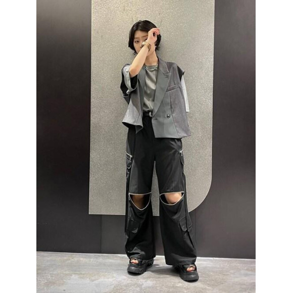ラメ感のあるベストはシンプルなTシャツをレイヤードする事で上級者見え!
