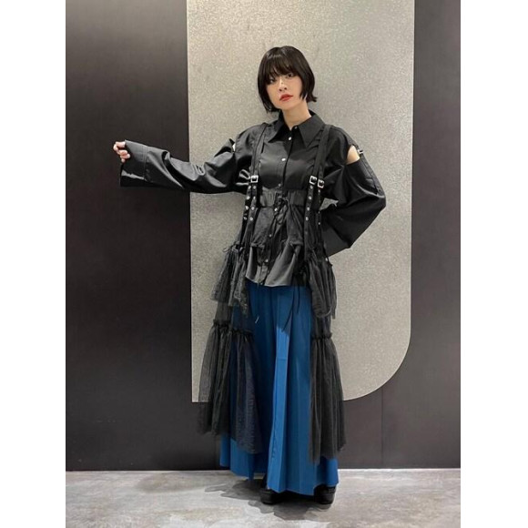 肩スリットが入ったデザインシャツは、程よい袖のボリューム感でゆったり着ていただけます。 シンプルなプリーツパンツにはサスペンダースカートをプラスする事で他と差別化! 一気にHAREらしいスタイリングになります⬛