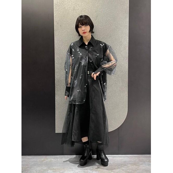 袖がシアー素材になっているデザインシャツ! シャツは一枚でもレイヤードにしても映えるHAREらしいデザイン! 長袖でも涼しく、今から秋まで重宝してくれます スカートはサイドに入ったトラックデザインが可愛いアイテム。 オールブラックでも重たくならないようにメッシュやシアー素材を使うのがポイント!