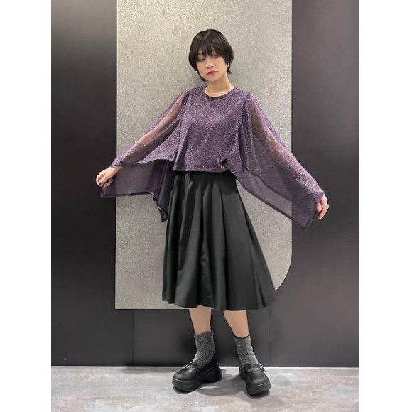 大人気のラメトップス! 袖の下が空いており、ガウンのような雰囲気で着ていただけます スカートは大人っぽく使えるミディ丈なので、年齢問わず楽しんでいただけます! ブーツはソックスを履いているようなデザインで、これからの時期はタイツと合わせたりしても⭕️
