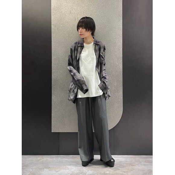 ダメージデザインが特徴的なシャツ ヴィンテージ感のあるダメージ加工と渋めのカラーラインナップで、羽織るだけで一気に上級者見え! テロっとした素材感はストレスフリーで着ていただけます。 インナーとボトムスはシンプルにして、シャツ主役のスタイリングにしてみました